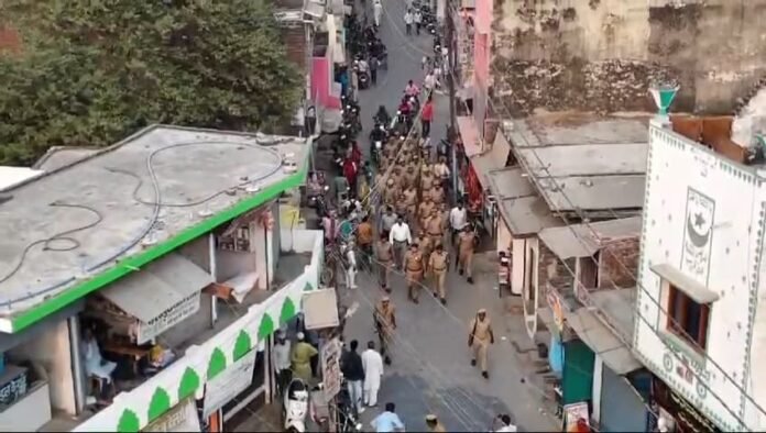एसएसपी ने पिपराइच में किया फ्लैग मार्च, ड्रोन से निगरानी।