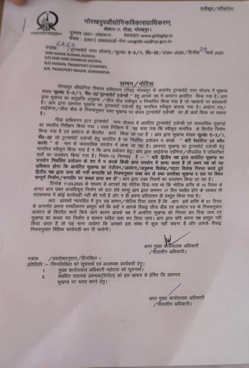 पहले चरण में बंटी रेस्टोरेंट, पेट पूजा ढाबा, ए 5 होटल एंड रेस्टोरेंट, खाना खजाना, व्हाइट हाउस होटल, बाबा रेस्टोरेंट, जायसवाल, राधा कृष्ण होटल पैलेस, तिवारी ढाबा, होटल कैलाश, होटल कृष्णा प्रताप और महफिल रेस्टोरेंट जैसे डेढ़ दर्जन प्रतिष्ठानों को नोटिस भेजा गया। नोटिस में स्पष्ट किया गया कि इन भूखंडों का उपयोग ट्रांसपोर्ट कारोबार के लिए होना था, लेकिन वर्तमान में ये होटल और ढाबे के रूप में संचालित हो रहे हैं।