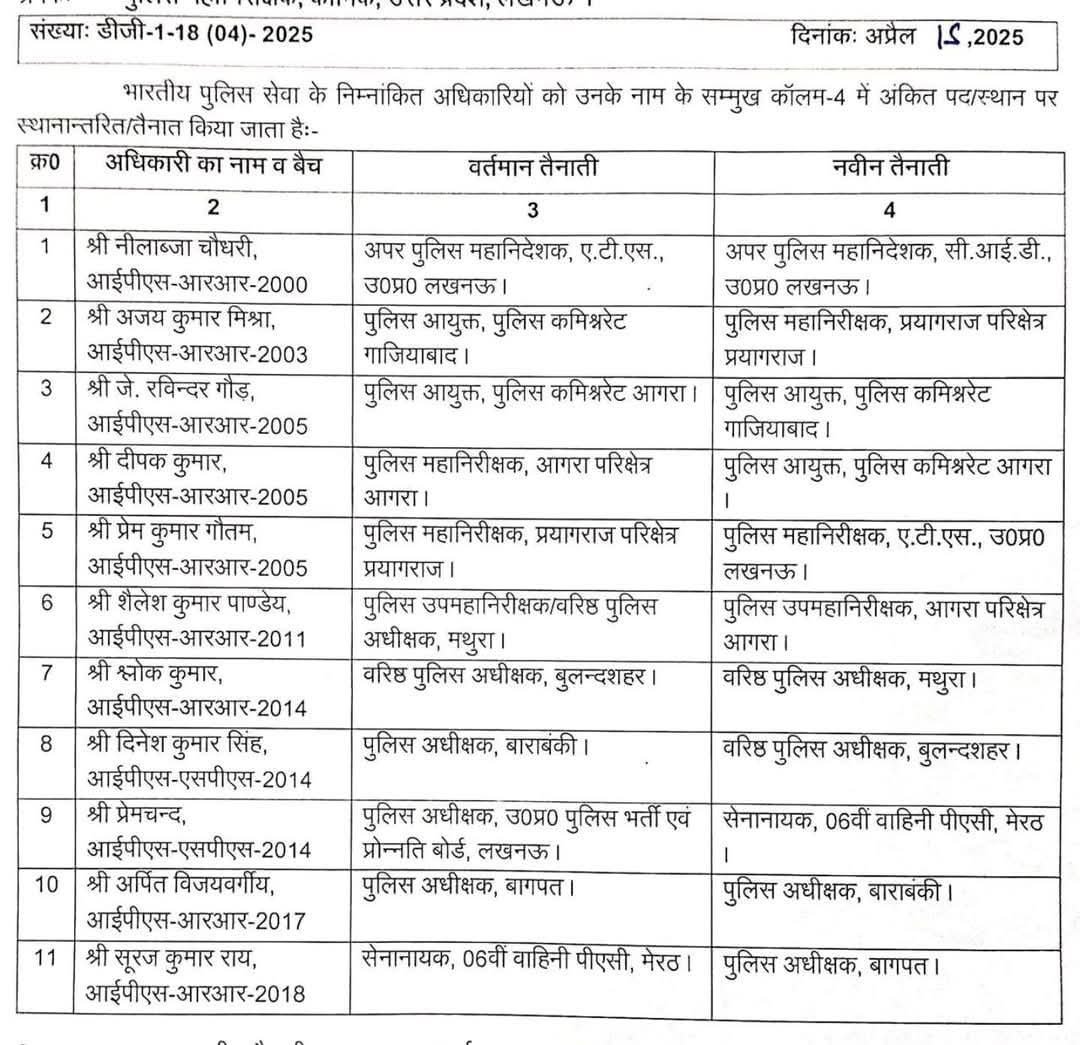 उत्तर प्रदेश में बड़ा पुलिस फेरबदल: 11 IPS अधिकारियों का तबादला, आगरा और गाजियाबाद को नए पुलिस कमिश्नर