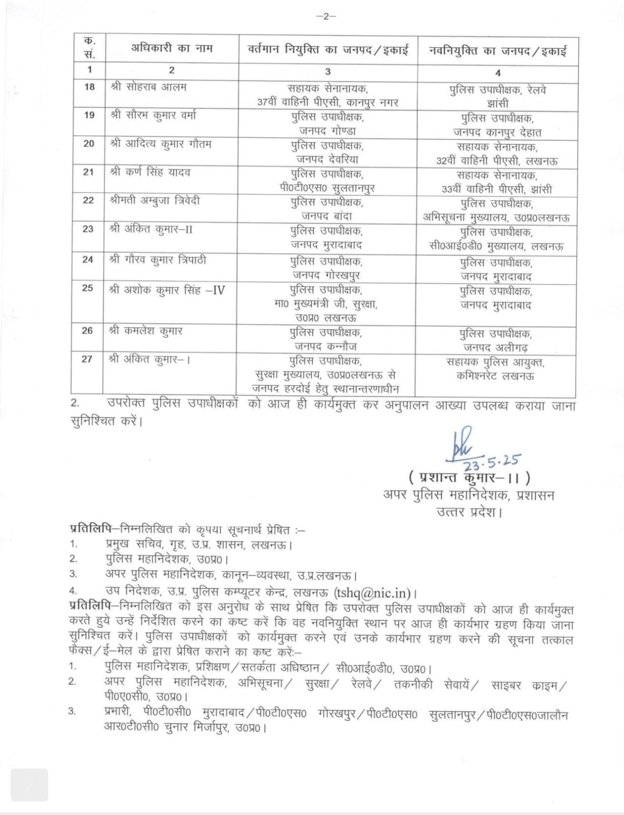 अंकित कुमार-II: पुलिस उपाधीक्षक, मुरादाबाद से पुलिस उपाधीक्षक, सीआईडी मुख्यालय, लखनऊ।