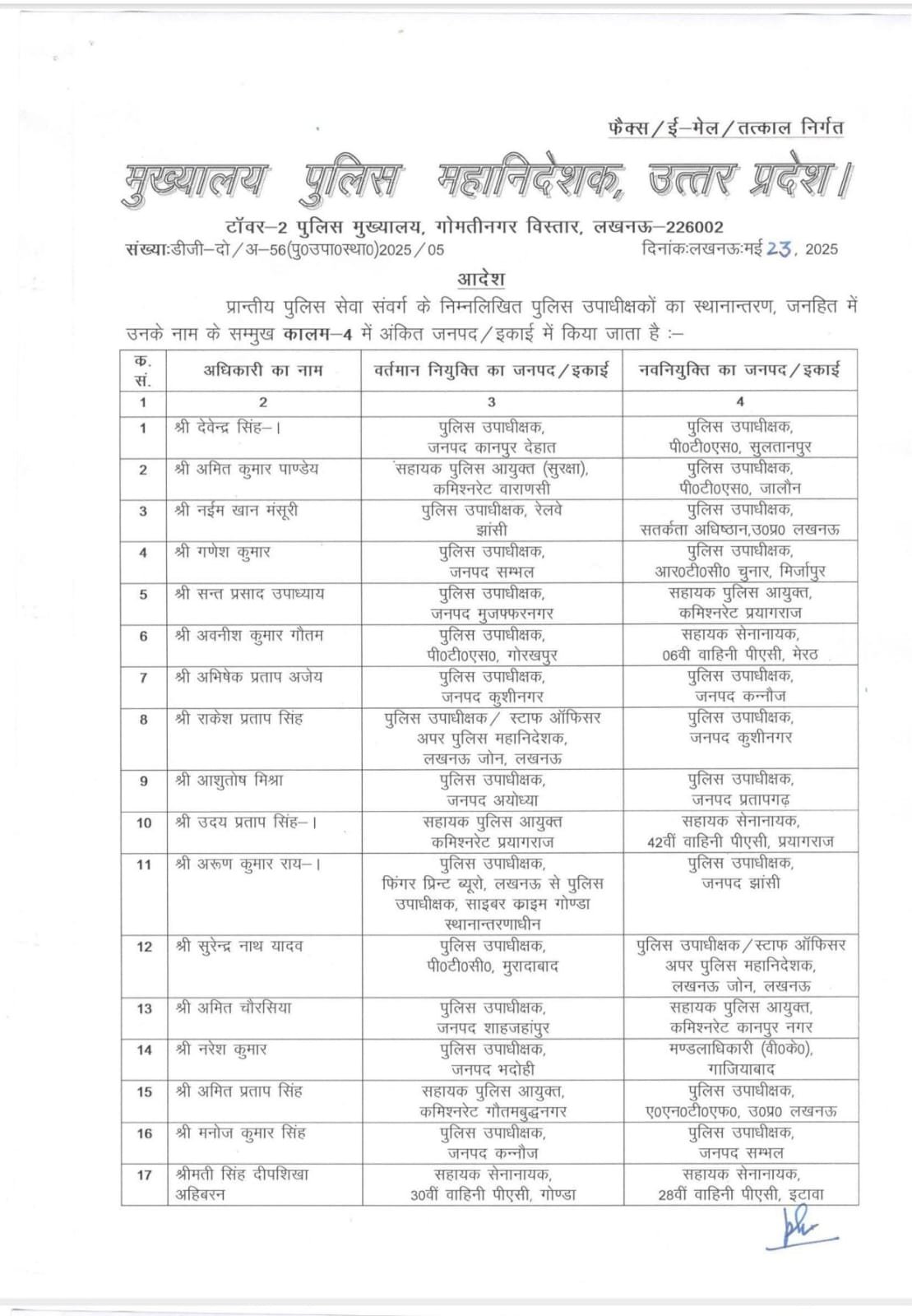 लखनऊ। उत्तर प्रदेश पुलिस में प्रशासनिक स्तर पर बड़े बदलाव के तहत कई पुलिस उपाधीक्षकों (डीएसपी) की नई तैनाती की गई है। अपर पुलिस महानिदेशक (प्रशासन) प्रशांत कुमार-II ने 23 मई 2025 को आदेश जारी कर अधिकारियों को तत्काल कार्यमुक्त करने और नए स्थान पर कार्यभार ग्रहण करने के निर्देश दिए।
