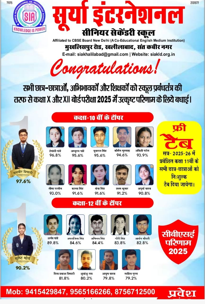 सूर्या सीनियर सेकेंडरी स्कूल, खलीलाबाद ने सीबीएसई बोर्ड की हाई स्कूल और इंटरमीडिएट परीक्षाओं में शानदार प्रदर्शन कर अपनी उत्कृष्टता का परचम लहराया है। स्कूल के 93.66% (कक्षा 10) और 88.39% (कक्षा 12) के प्रभावशाली पास प्रतिशत ने छात्रों, अभिभावकों और शिक्षकों में उत्साह की लहर पैदा कर दी है। यह सफलता स्कूल के समर्पित शिक्षकों और गुणवत्तापूर्ण शिक्षा प्रणाली का प्रमाण है, जो छात्रों के भविष्य को उज्ज्वल बनाने में महत्वपूर्ण भूमिका निभा रही है। इस शानदार प्रदर्शन के चलते 11वीं कक्षा में प्रवेश के लिए अभूतपूर्व भीड़ देखी जा रही है।