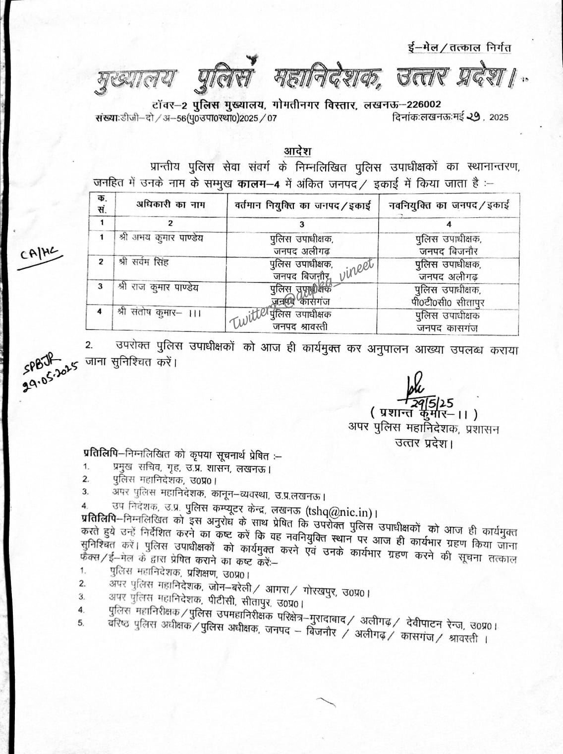 उत्तर प्रदेश में चार पुलिस उपाधीक्षकों का स्थानांतरण, तत्काल कार्यभार ग्रहण का निर्देश