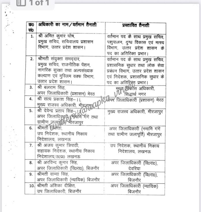 उत्तर प्रदेश में 10 प्रशासनिक अधिकारियों को अतिरिक्त प्रभार व स्थानांतरण