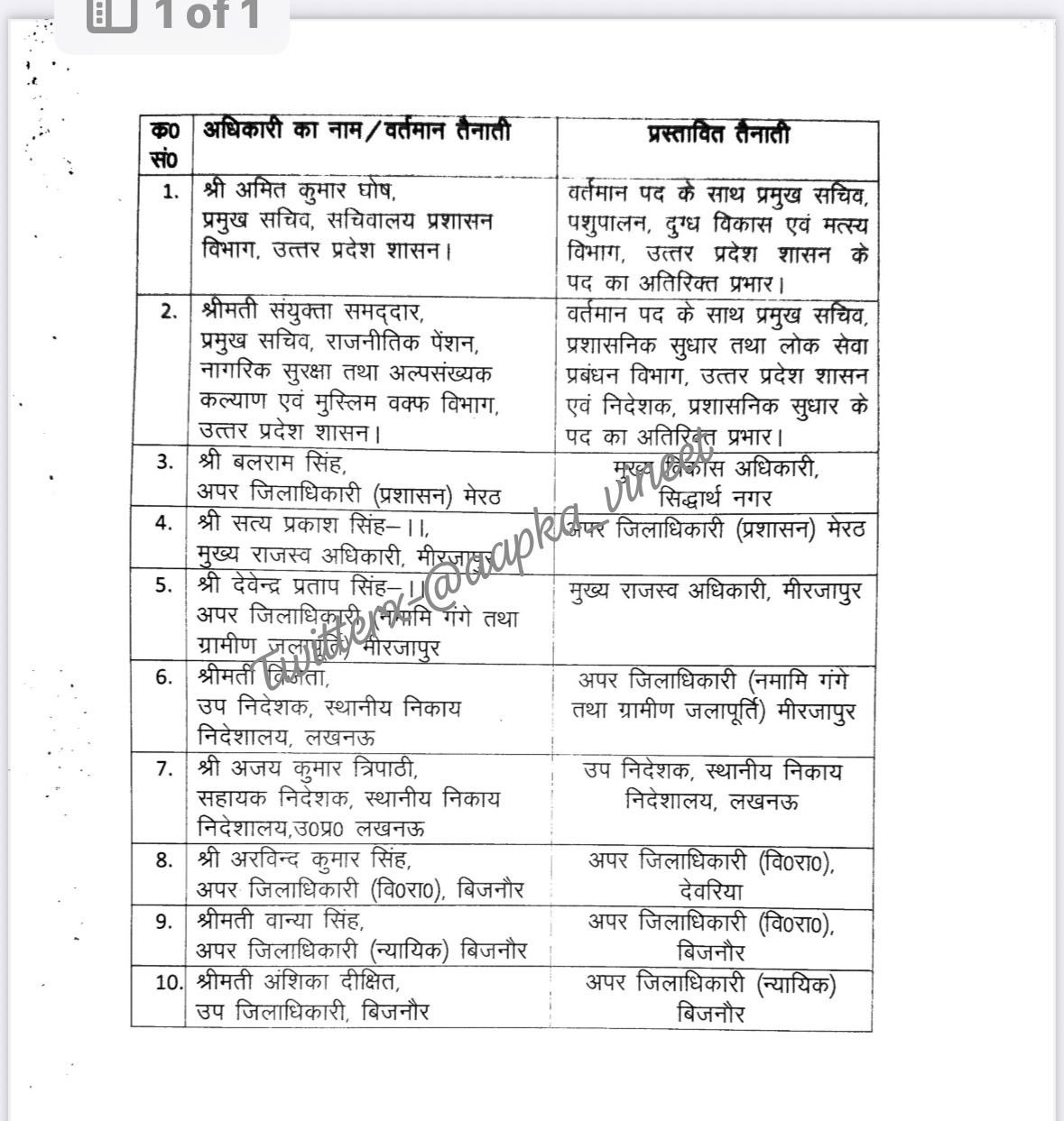 अरविंद कुमार सिंह: वर्तमान में अपर जिलाधिकारी (वित्त और राजस्व), बिजनौर। प्रस्तावित तैनाती: अपर जिलाधिकारी (वित्त और राजस्व), देवरिया।
