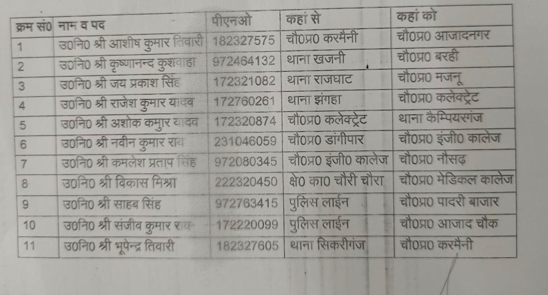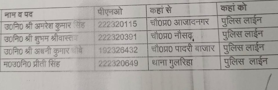 गोरखपुर। एसएसपी राजकरन नय्यर ने पुलिस व्यवस्था को चुस्त-दुरुस्त करने के लिए कई चौकी प्रभारियों का तबादला किया, साथ ही कुछ को लाइन हाजिर कर दिया। उप निरीक्षक अमरेश कुमार सिंह (आजाद नगर) और शुभम श्रीवास्तव (नौसढ़) को पुलिस लाइन भेजा गया। अश्वनी कुमार चौबे (पादरी बाजार) और प्रीति सिंह (गुलरिया) भी लाइन हाजिर हुई। आशीष कुमार तिवारी को करमैनी से आजाद नगर, कृष्णानंद कुशवाहा को खजनी से बरही, जयप्रकाश सिंह को राजघाट से मजनू, राजेश कुमार यादव को झंगहा से कलेक्ट्रेट, अशोक कुमार यादव को कलेक्ट्रेट से कैंपियरगंज, नवीन कुमार राय को डांगीपार से इंजीनियरिंग कॉलेज, कमलेंद्र प्रताप सिंह को इंजीनियरिंग कॉलेज से नौसढ़, विकास मिश्रा को चौरी चौरा से मेडिकल कॉलेज, साहब सिंह को पुलिस लाइन से पादरी बाजार और संजीव कुमार राय को पुलिस लाइन से आजाद चौक की जिम्मेदारी सौंपी गई। भूपेंद्र तिवारी सिकरीगंज से करमैनी चौकी प्रभारी बने। यह कदम पुलिस प्रशासन की कार्यप्रणाली को और प्रभावी बनाने की दिशा में उठाया गया है।