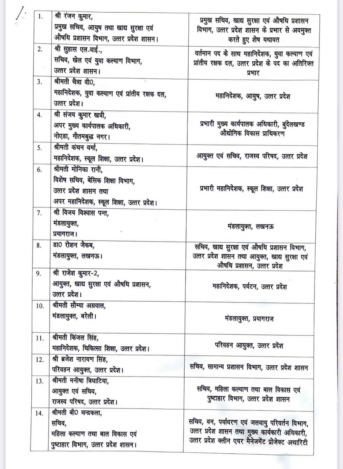 बृजेश नारायण सामान्य प्रशासन सचिव बने। रंजन कुमार से खाद्य सुरक्षा विभाग हटाकर आयुष सचिव बनाए रखा गया, जबकि सुहास हवाई को युवा कल्याण का अतिरिक्त चार्ज मिला।