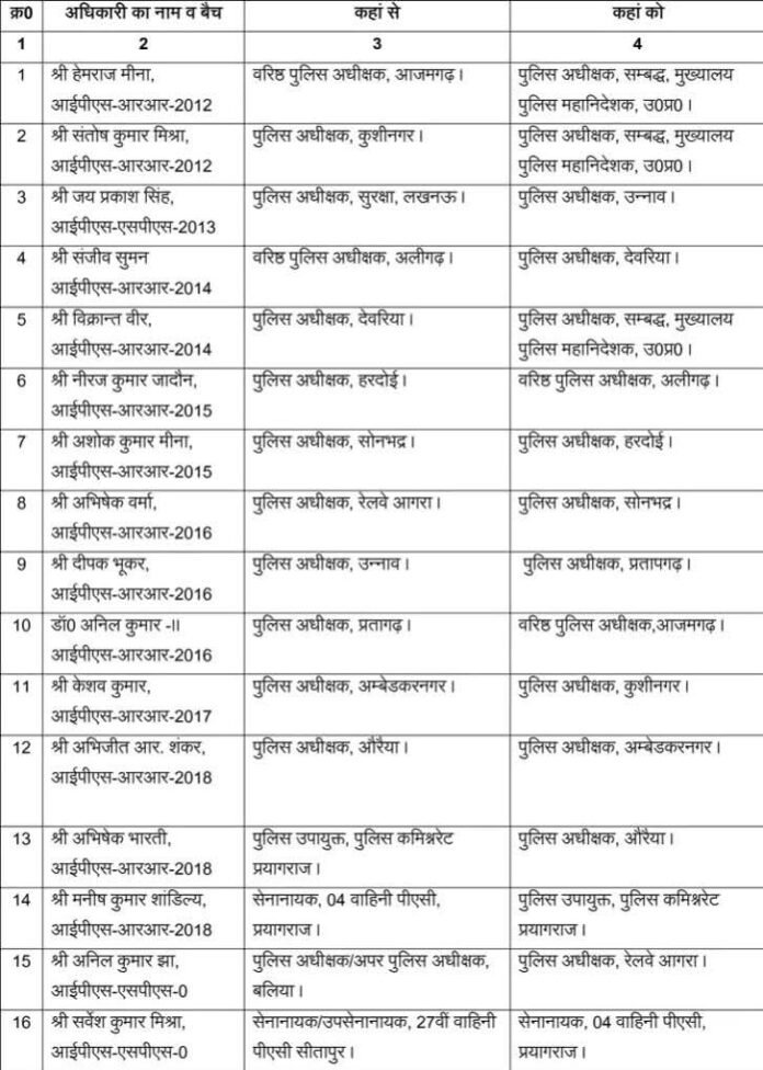 नए नियुक्तियों में जयप्रकाश सिंह को उन्नाव का नया एसपी बनाया गया। संजीव सुमन देवरिया के एसपी, नीरज कुमार जादौन अलीगढ़ के एसएसपी, अशोक कुमार मीणा हरदोई के एसपी, अभिषेक वर्मा सोनभद्र के एसपी, दीपक भूकर प्रतापगढ़ के एसपी, डॉ. अनिल कुमार द्वितीय आजमगढ़ के एसपी, केशव कुमार कुशीनगर के एसपी, अभिजीत आर. शंकर अंबेडकर नगर के एसपी, अभिषेक भारती औरैया के एसपी बने। मनीष शांडिल्य प्रयागराज पुलिस कमिश्नरेट के डीसीपी, अनिल कुमार झा आगरा रेलवे के एसपी और सर्वेश मिश्रा प्रयागराज की चौथी वाहिनी पीएसी के सेनानायक नियुक्त हुए।