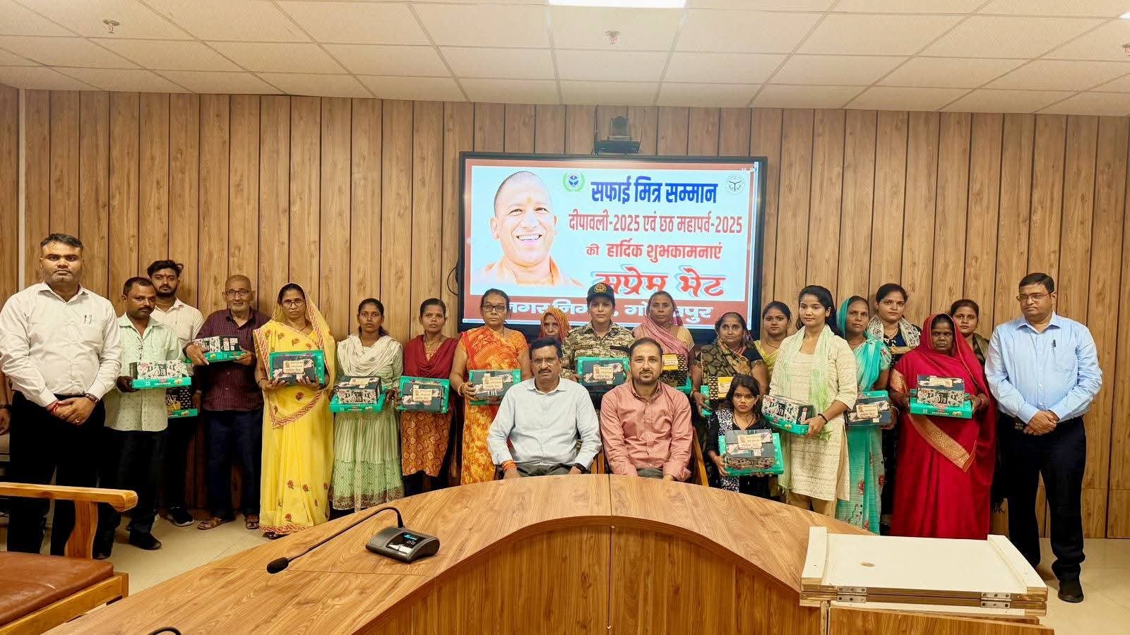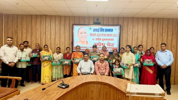 गोरखपुर। शनिवार को नगर निगम परिसर में दीपावली और छठ महापर्व के उपलक्ष्य में एक भावनात्मक समारोह आयोजित हुआ। महापौर डॉ. मंगलेश श्रीवास्तव, नगर आयुक्त गौरव सिंह सोगरवाल और अपर नगर आयुक्त की उपस्थिति में सफाई कर्मियों व समस्त स्टाफ को मिठाइयाँ और उपहार भेंट कर सम्मानित किया गया। यह आयोजन न केवल कर्मचारियों के परिश्रम को सराहा, बल्कि स्वच्छता के प्रति उनके समर्पण को भी रेखांकित किया।कार्यक्रम में नगर निगम परिवार के कर्मठ सफाई कर्मियों की प्रशंसा की गई।