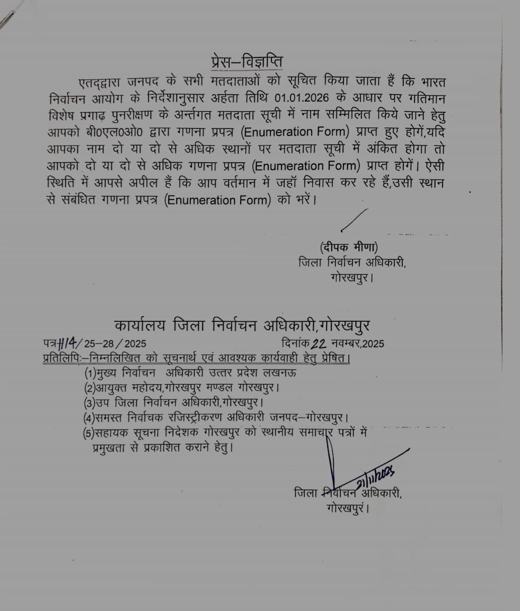 गोरखपुर। जिला निर्वाचन अधिकारी एवं जिलाधिकारी दीपक मीणा ने सभी मतदाताओं से साफ-साफ अपील की है कि 01 जनवरी 2026 की अर्हता तिथि के आधार पर चल रहे विशेष पुनरीक्षण में अपना नाम मतदाता सूची में बनाए रखने के लिए गणना प्रपत्र (Enumeration Form) भरना अनिवार्य है। इसे न भरने पर नाम सूची से हटाया जा सकता है।