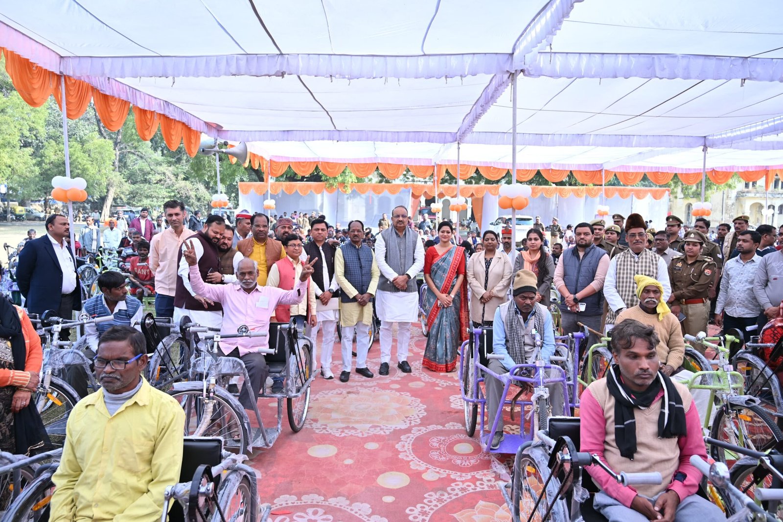 जब एक बुजुर्ग माँ ने मोटराइज्ड ट्राइसाइकिल पर बैठकर पहली बार स्वयं चलाया तो उनकी आँखों में आँसू और चेहरे पर मुस्कान देख पूरा पंडाल भाव-विभोर हो उठा।