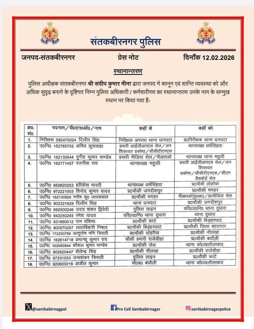 संतकबीरनगर। जनपद की कानून-व्यवस्था को और मजबूत बनाने के उद्देश्य से पुलिस अधीक्षक संदीप कुमार मीना ने गुरुवार को पुलिस महकमे में बड़ा फेरबदल किया। जारी आदेश के तहत तत्काल प्रभाव से 18 पुलिस अधिकारियों/कर्मचारियों का स्थानांतरण किया गया है। सभी को नए तैनाती स्थलों पर कार्यभार ग्रहण करने के निर्देश दिए गए हैं।