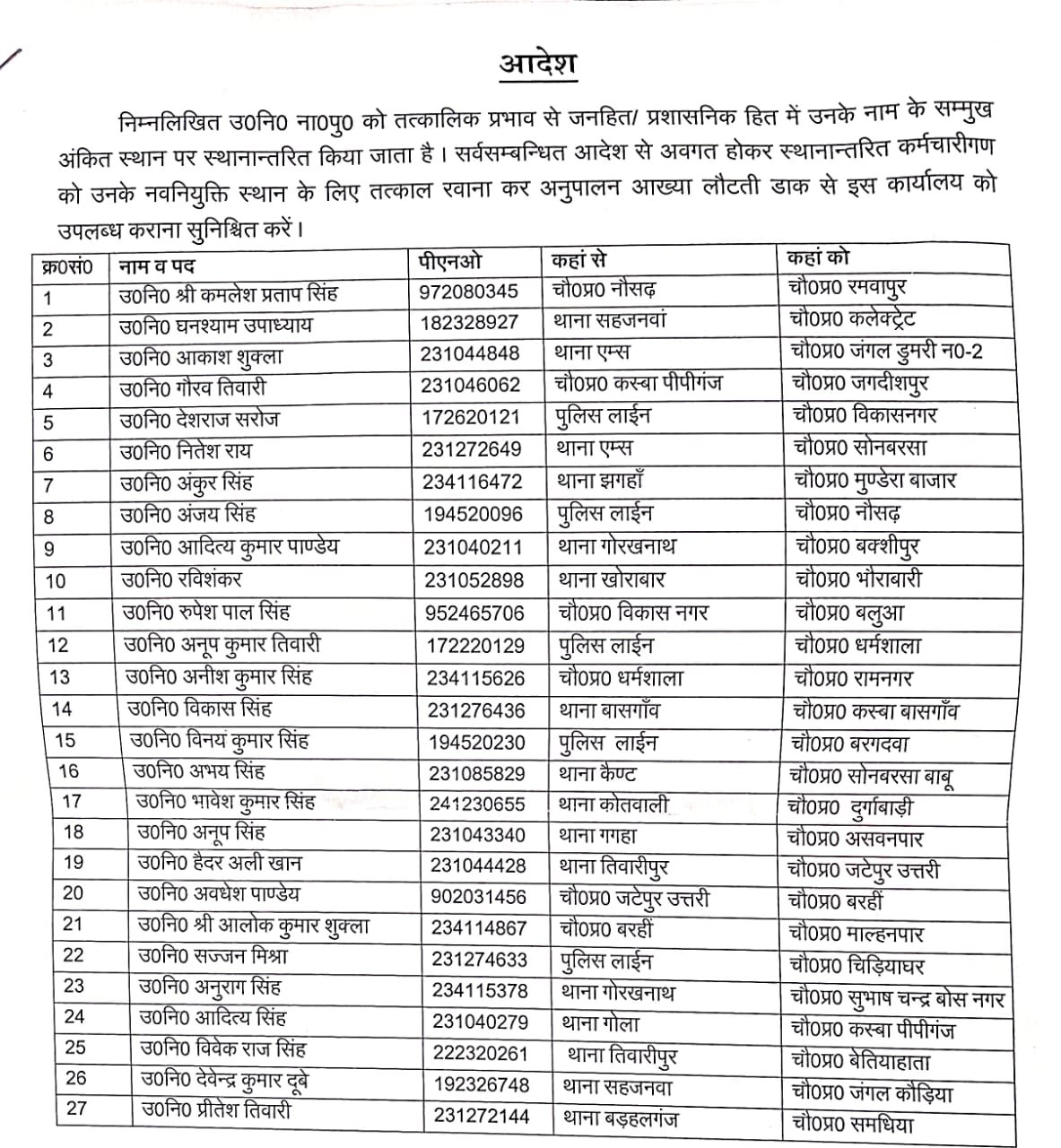 गोरखपुर। गोरखपुर पुलिस में बड़े पैमाने पर तबादले कर दिए गए हैं। वरिष्ठ पुलिस अधीक्षक डॉ. कौस्तुभ ने 27 उपनिरीक्षकों को एक जगह से दूसरी जगह स्थानांतरित कर अनुशासन की सख्ती दिखाई है। इनमें कई चौकी प्रभारी भी शामिल हैं,