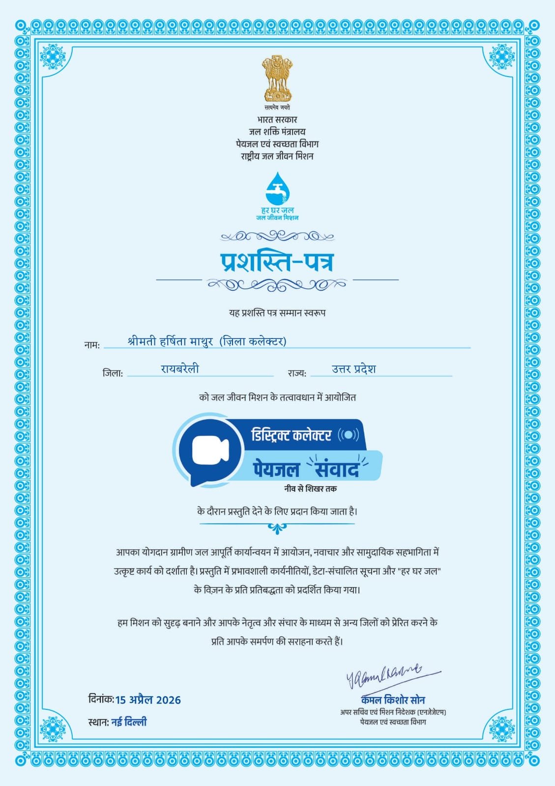 रायबरेली। भारत सरकार के जल शक्ति मंत्रालय द्वारा संचालित ‘जल जीवन मिशन’ के तहत रायबरेली जनपद ने एक बड़ी उपलब्धि हासिल की है। 15 अप्रैल 2026 को नई दिल्ली में आयोजित ‘पेयजल संवाद’ के 7वें संस्करण में जिलाधिकारी हर्षिता माथुर को उनके उत्कृष्ट कार्यों के लिए प्रशस्ति-पत्र देकर सम्मानित किया गया।
