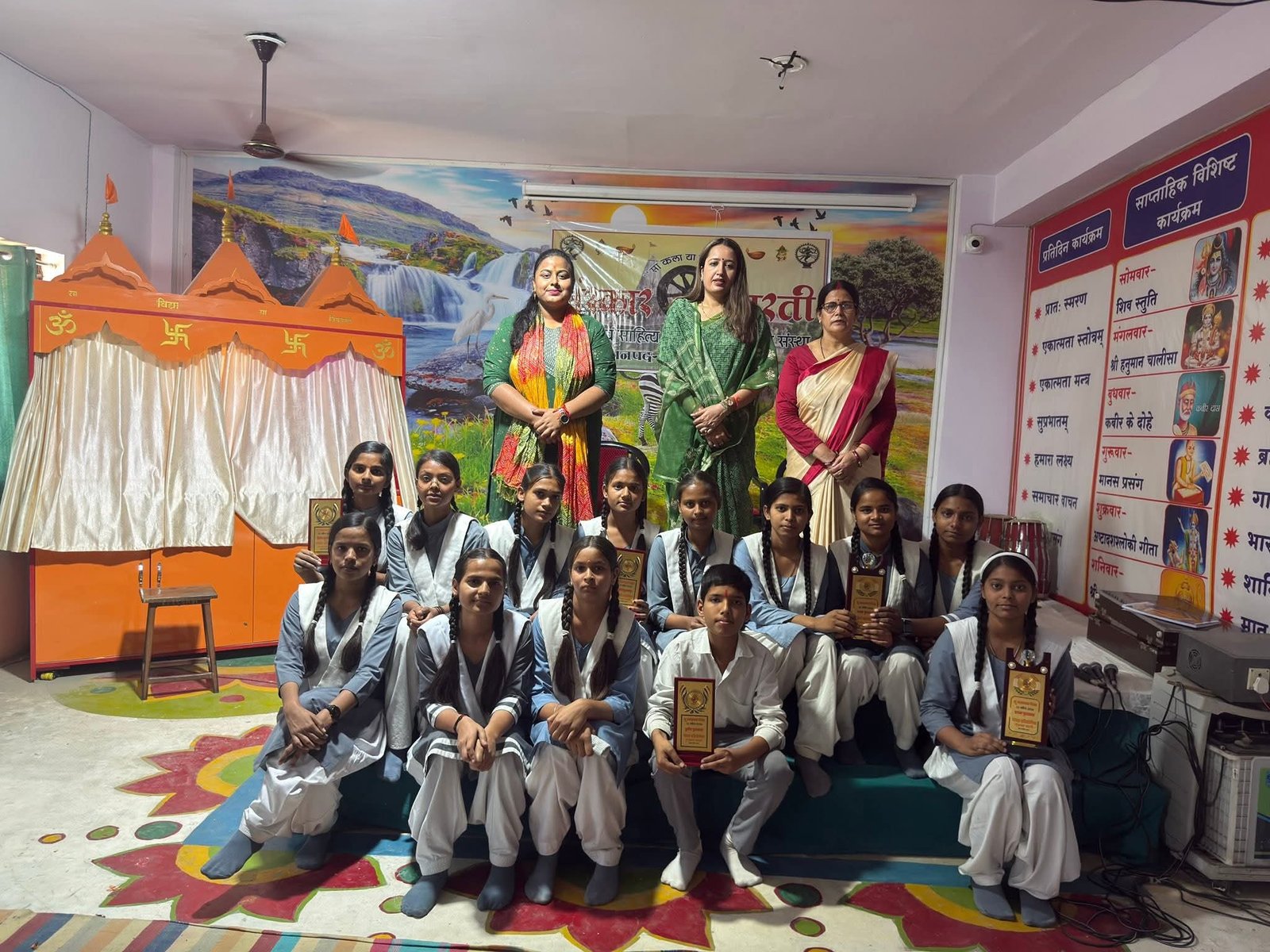 रंगोली प्रतियोगिता में अंशिका, मुस्कान, साक्षी और अनुष्का ने संयुक्त रूप से प्रथम स्थान हासिल किया। छात्राओं ने अपनी कला के माध्यम से पृथ्वी संरक्षण का संदेश दिया।